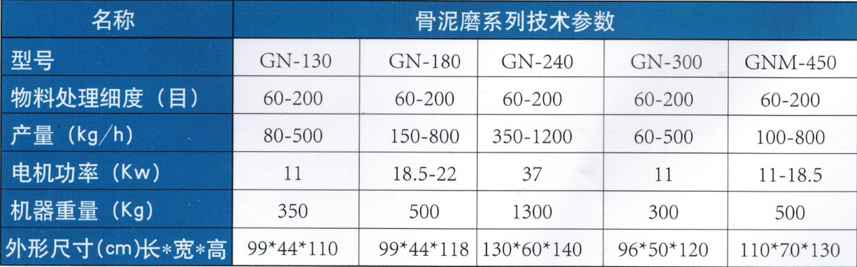 能加工禽骨:如雞骨架、鴨骨架;畜骨:如豬骨、牛羊骨;豬皮、雞皮及各種魚(yú)、肉類(lèi)等。骨泥加工工藝流程:粗碎-〉粗磨一〉精磨->鮮骨泥廣泛應用于各種香腸、火腿、午餐肉、丸子、咸味香精、骨髓浸膏、寵物食品、速凍食品、餐飲配料、骨湯、軟骨素、骨膠、骨粉、高鈣食品、保健品、生物制藥等行業(yè)。